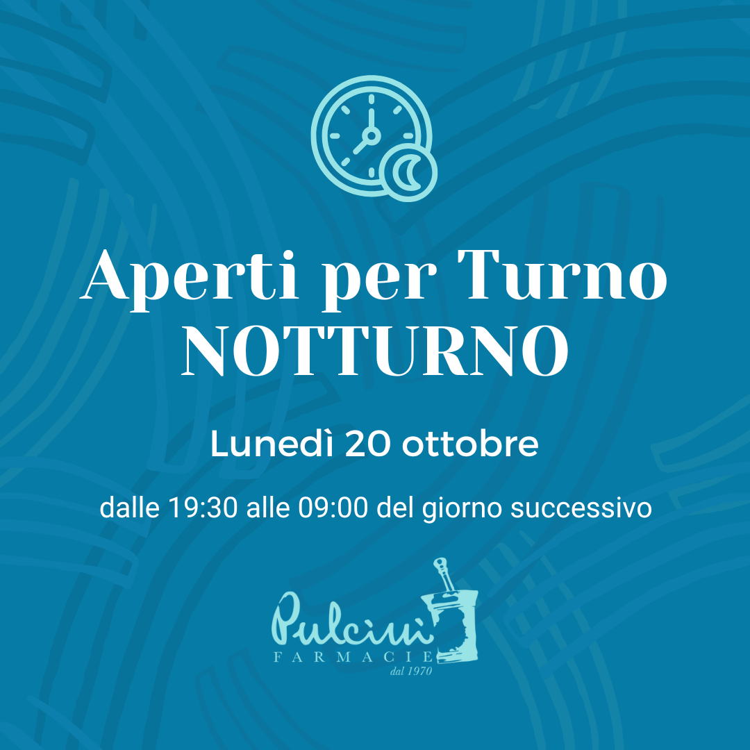 La nostra farmacia è aperta per turno notturno dalle ore 19:30 di lunedì 20 ottobre alle ore 09:00 del giorno successivo.