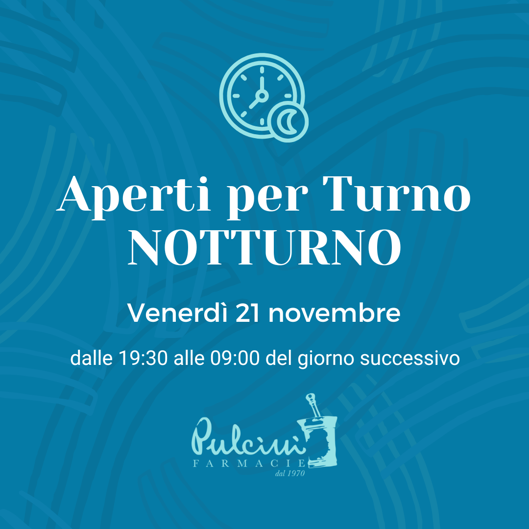 La nostra farmacia è aperta per turno notturno dalle ore 19:30 di venerdì 21 novembre alle ore 09:00 del giorno successivo.